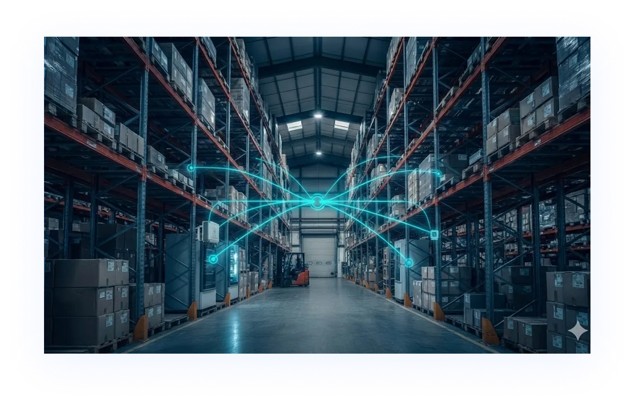 Problem: Massive, metal-rich warehouse environments are difficult to cover with traditional wireless signals. Managers need real-time visibility into environmental conditions for inventory preservation and cost-effective tracking of mobile assets (forklifts, palettes) without the high cost of cellular IoT or the complexity of extensive Wi-Fi deployment.