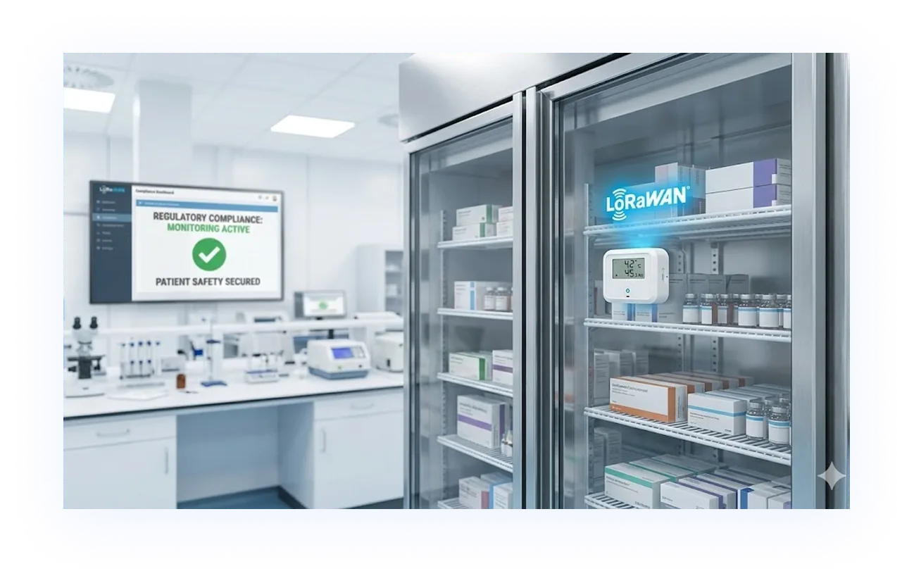 Problem: Healthcare facilities require continuous, real-time monitoring for critical environmental conditions (like temperature and humidity for pharmaceuticals and labs) and asset location. Traditional Wi-Fi or manual checks are too costly, unreliable, or insufficient for meeting strict regulatory compliance standards and ensuring patient safety.