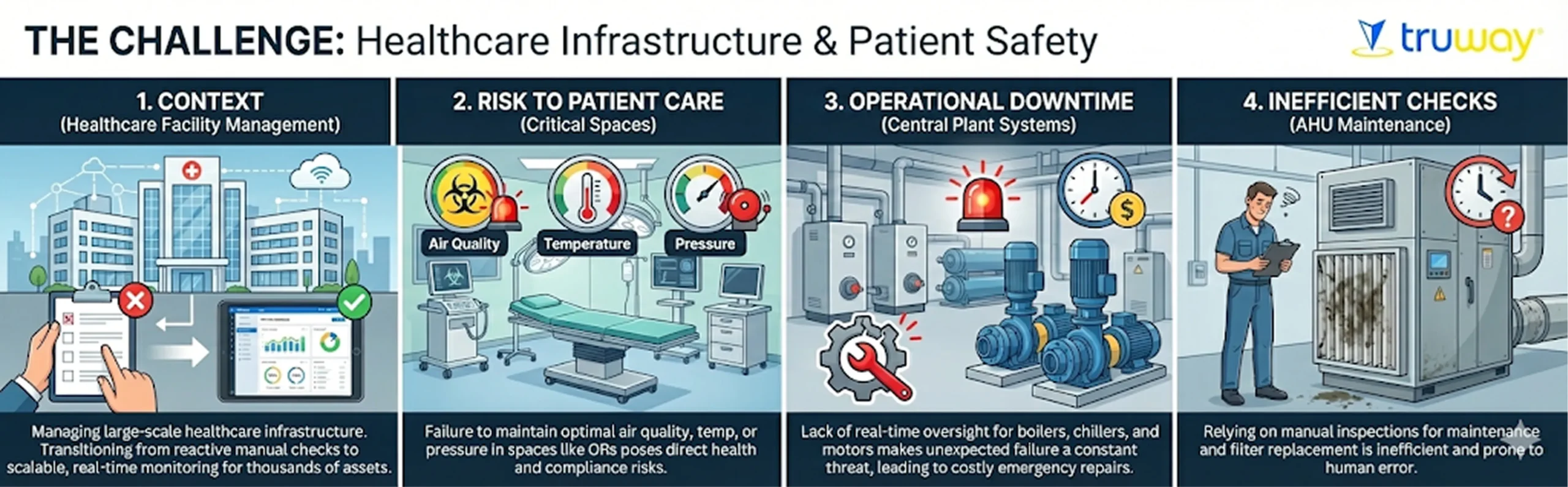 Context: Healthcare facility manages critical infrastructure for large-scale healthcare facilities, where operational failures carry significant risk to patient safety, equipment longevity, and regulatory compliance. The challenge was transitioning from reactive maintenance and manual checks to a scalable, real-time monitoring solution for thousands of critical assets.