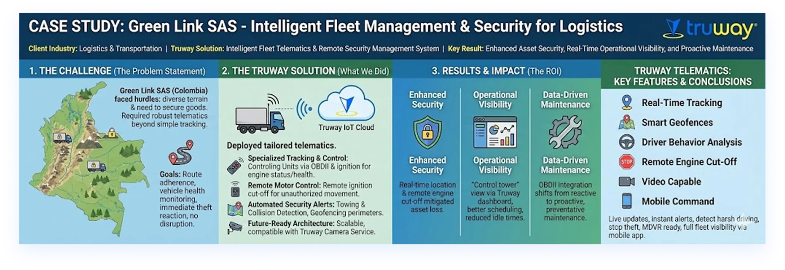 Future-Ready Architecture: The platform was designed for scalability and is compatible with Truway's Camera Service, enabling Green Link SAS to easily integrate constant video monitoring and real-time recording as their security needs increase.