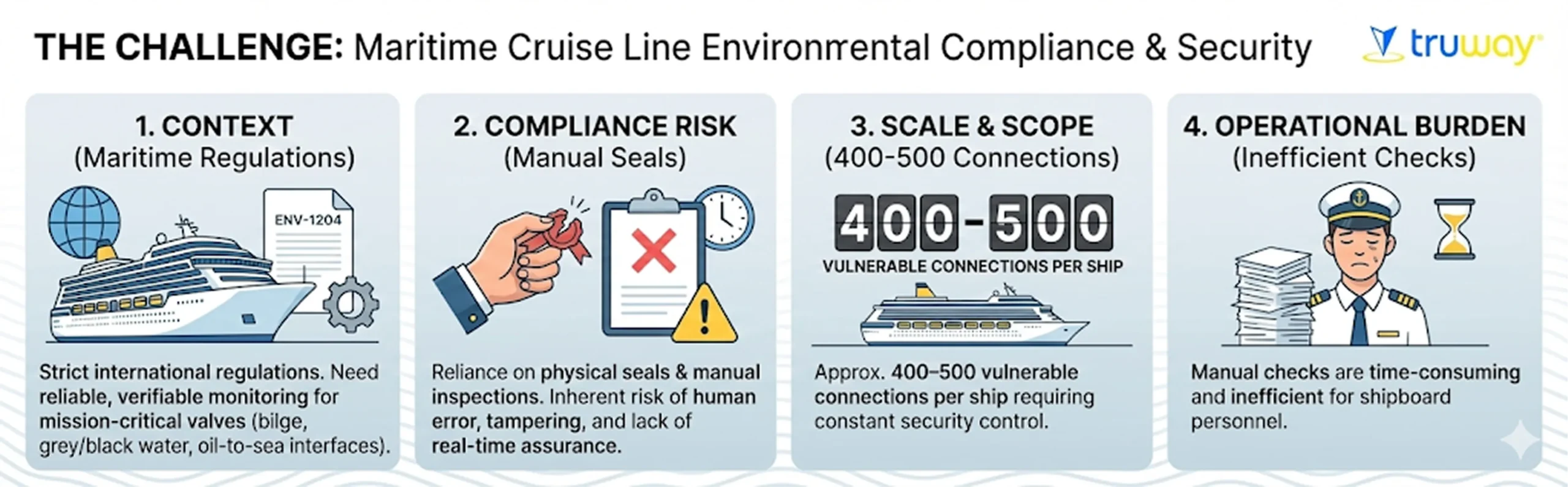 Context: Maritime Cruise Line operates under strict international maritime regulations and internal Environmental Control System (ECS) procedures (ENV-1204). The company needed a reliable, verifiable method to secure and monitor mission-critical valves and cross-connections within the engine and machinery spaces—particularly those related to bilge, grey water, black water treatment, and oil-to-sea interfaces.