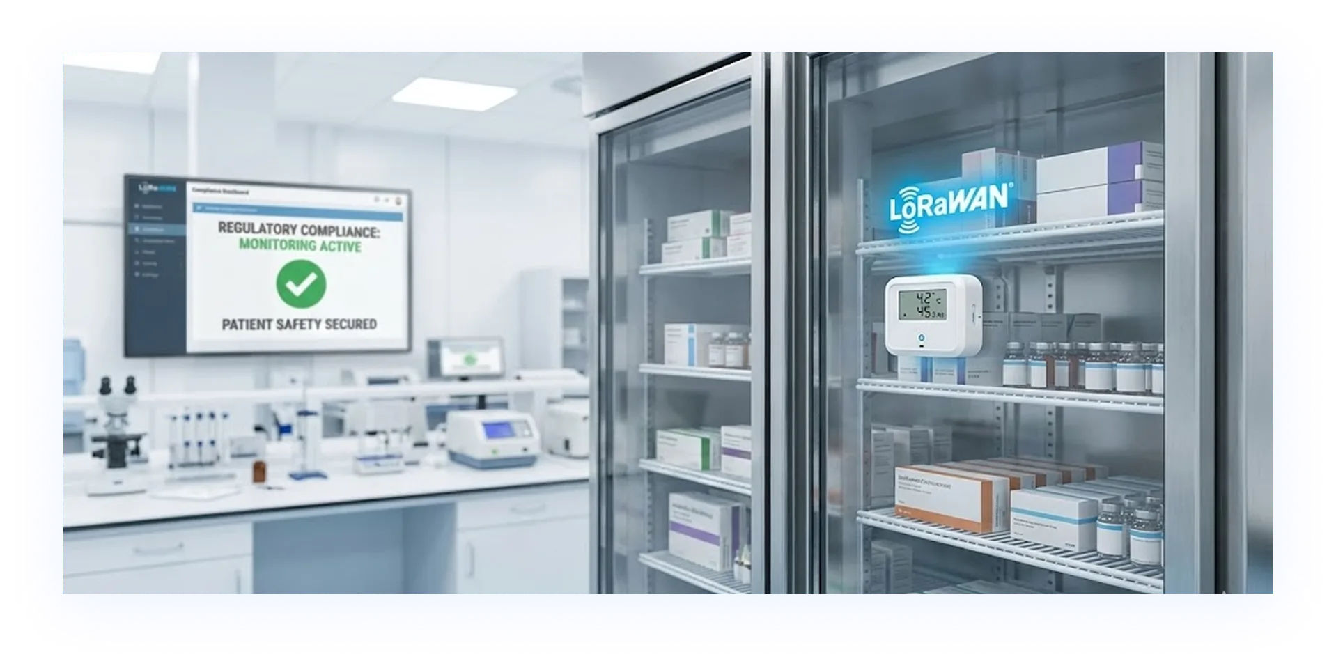 Problem: Healthcare facilities require continuous, real-time monitoring for critical environmental conditions (like temperature and humidity for pharmaceuticals and labs) and asset location. Traditional Wi-Fi or manual checks are too costly, unreliable, or insufficient for meeting strict regulatory compliance standards and ensuring patient safety.